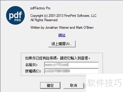 6、 首次使用pdfFactory Pro虚拟打印时,会出现注册对话框,提示用户购买,这是对开发工程师的一种支持。若不注册,转换后的PDF文档边缘会带有软件标识,可能影响使用体验,建议注册为佳,网上可找到不少注册码资源。
