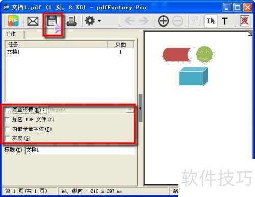 7、 使用pdfFactory Pro打印完成后,会显示一个对话框呈现效果。在此窗口中,可以对PDF文件添加图章、设置加密,还能将彩色文档调整为灰度模式。确认无误后点击保存,即成功转换为PDF格式。现在,让我们打开刚保存的PDF文件,查看最终效果吧!