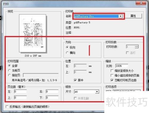 5、 在打印机选项里,选定pdfFactory Pro虚拟打印机。关于1里的相关参数,可按需自行调节。设置完毕后,点击打印按钮即可。