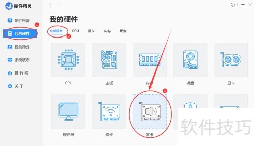 3、 第三步,进入检测页面,依次点击我的硬件、全部设备和声卡图标。