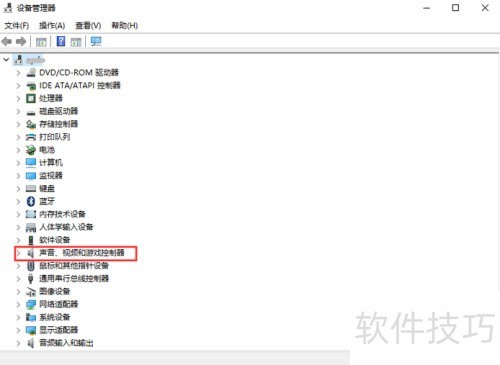 3、 打开设备管理器,找到声音、视频和游戏控制器选项,然后点击它。