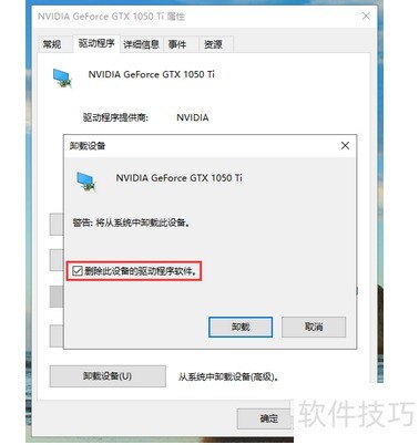 4、 在弹出的确认窗口里,勾选删除该设备的驱动程序软件选项,随后点击卸载按钮,即可完成显卡驱动的卸载操作。