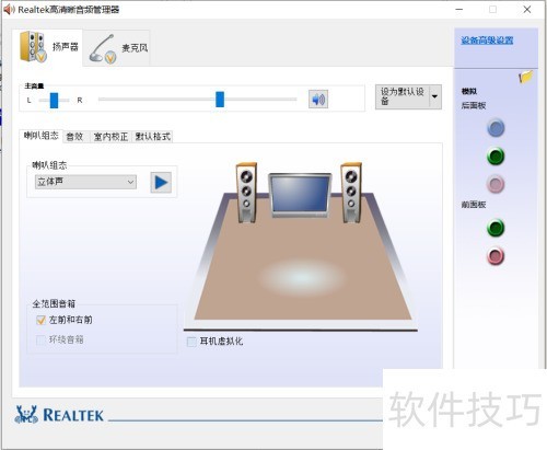 5、 接下来,进行你熟悉的声音设置操作吧!有时确实需要使用Realtek高清晰音频管理器,它比Windows自带的更专业,毕竟系统默认选项无法调节前后音频面板。
