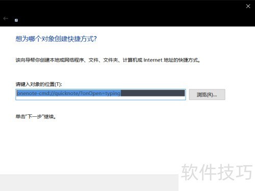 3、 打开新建快捷方式窗口,在对象位置栏输入指定内容。