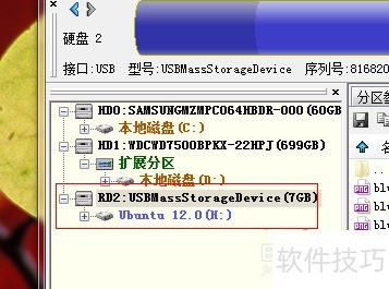 3、 启动DG分区工具后,在U盘驱动器列表中,下方会显示一个分区,此时请勿选择该分区,而应直接选中对应的存储设备驱动器。