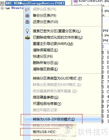 4、 右键点击设备驱动器,在开始菜单中会出现两个选项:一是转换为USB-ZIP模式,二是制作USB-HDD启动盘。这两个功能实际上是DG分区工具为U盘装系统用户提供的烧录格式转换接口,便于用户根据需求选择合适的启动模式进行系统安装。