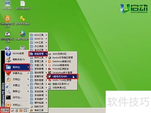 2、 进入Win03PE系统后,将需格式化的U盘插入电脑USB接口,然后依次点击开始菜单、程序、磁盘管理,选择U盘格式化HDD功能,具体操作所示。