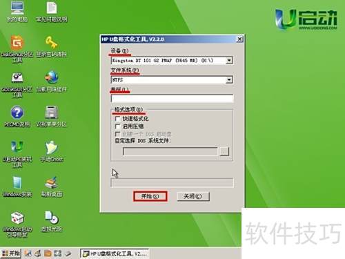 3、 启动U盘格式化工具HDD后,主界面会显示设备选择、文件系统、卷标及格式化参数等选项,设置完毕后,点击开始即可执行操作,具体界面所示。