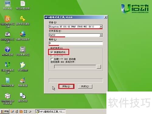 3、 选择要格式化的U盘,设定文件系统类型,可自定义卷标,勾选快速格式化,点击开始按钮执行操作,主窗口界面所示。整个过程简洁明了,便于用户快速完成U盘格式化。
