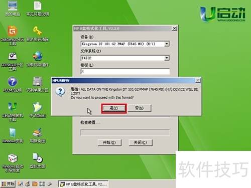 4、 将弹出提示窗口,提醒格式化U盘会清除所有数据,请提前备份以防丢失。确认后点击是继续操作,所示。
