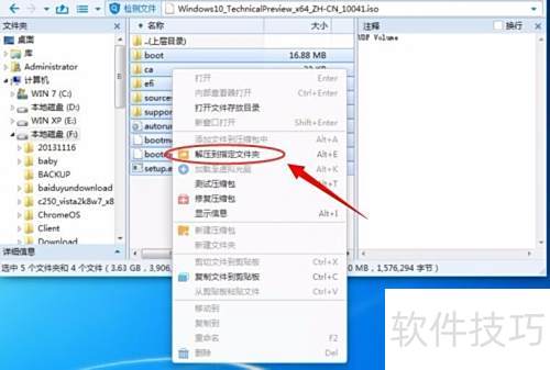 2、 打开ISO文件后,全选其中内容,右键选择解压到指定文件夹,随后选定目标盘符的主目录,确认并开始解压即可完成操作。