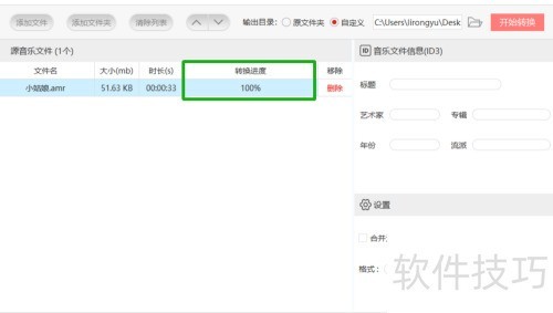 4、 点击开始转换,等待进度达到100%,表示转换完成,此时音频已成功变为MP3格式。