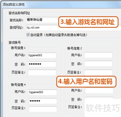 2、 在弹出窗口中依次填写游戏名称、网址、用户名和密码,确认无误后点击确定,即可成功添加至我的游戏列表。