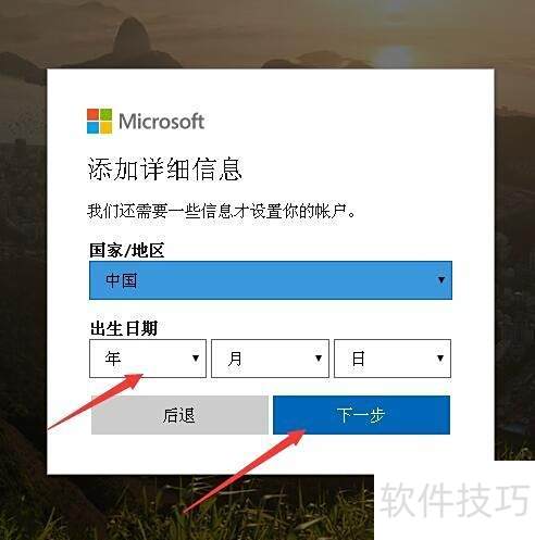 4、 在国家/地区栏选择所在地,接着在出生日期的年、月、日选项中逐一选定具体日期,完成后点击下一步继续操作。