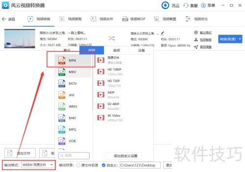 5、 将输出格式设置为MP4,以便将WebM文件转换为MP4格式,直接选择MP4即可完成转换。
