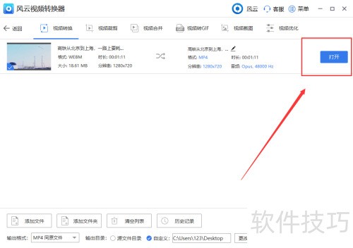 7、 转换完成后,点击右上角打开按钮,即可查看已转为MP4格式的视频。