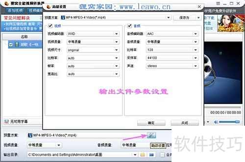 2、 选择格式后,需对输出的MP4文件进行参数设置,包括视频分辨率、编码方式、比特率等。若目标设备为手机,务必确保各项参数与手机支持的规格匹配,否则可能提示格式不支持等错误。可点击右侧高级设置按钮,在弹出的配置窗口中进行详细调整,具体设置参考图示,以保证转换后的视频能在手机上正常播放。