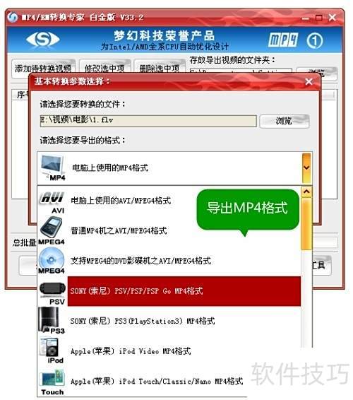 4、 所示,MP4/RM转换专家可将视频转换为多种主流格式,如AVI、FLV、MP4等,兼容PSP、影碟机、iPhone、iPad及各类安卓设备。用户可根据所用设备的具体要求,灵活选择合适的MP4格式进行导出,确保视频在不同硬件上流畅播放。
