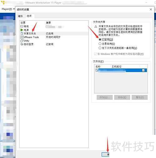 5、 点击左侧共享文件夹,再点右侧已禁用按钮,最后确认即可,操作所示。