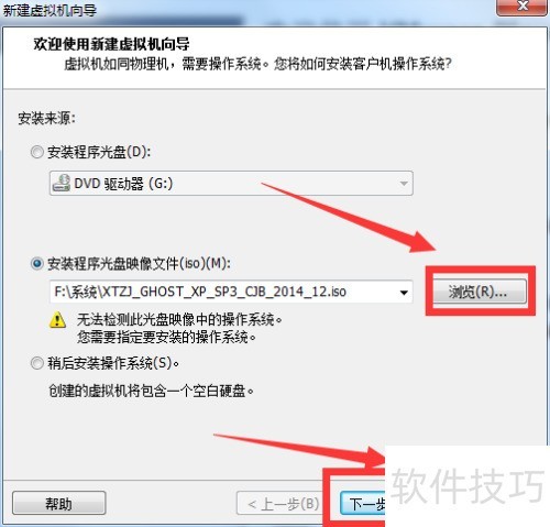 3、 打开新建虚拟机向导,选择第二个选项,点击浏览找到已下载的Ghost系统文件,确认后点击下一步继续操作。