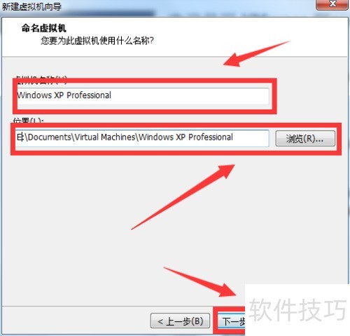 5、 设定虚拟机名称及保存位置,建议避免C盘,完成后点击下一步。