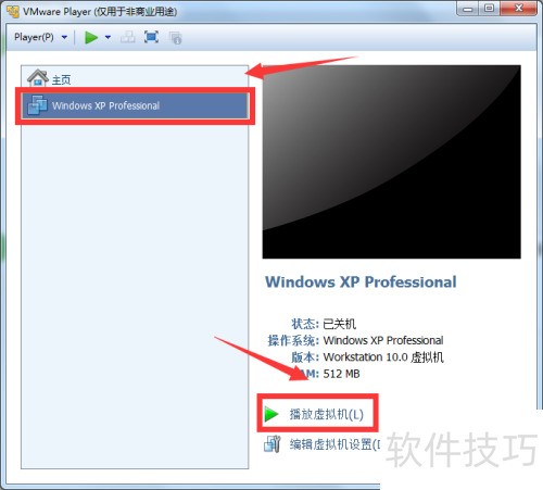 8、 此时左侧列表会出现新创建的虚拟机,选中后点击右侧播放虚拟机按钮即可启动。