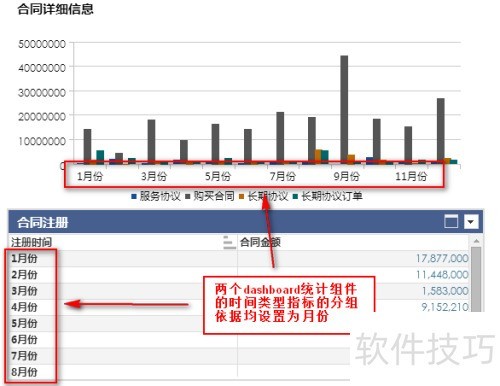12、 点击右上角按钮进入软件组件配置界面,从合同信息表中拖拽注册时间与合同签约时间字段至指定区域,操作所示。