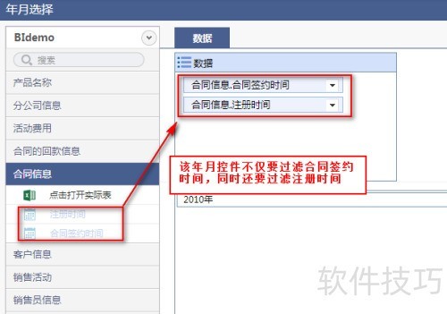 13、 选择合同签约时间控件,点击右上角按钮进入FineBI组件配置界面,从合同信息表中拖入注册时间字段,并将控件类型设置为按月份显示,具体操作所示。