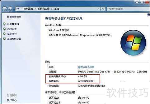 4、 重启电脑后,查看我的电脑属性,内存显示为4GB,所示。