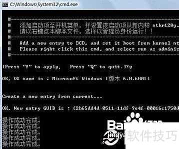 2、 解压后运行包内AddBootMenu程序,弹出对话框时输入Y并回车,系统将提示破解成功。此操作需以管理员权限执行,否则无法完成。