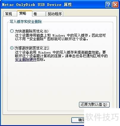 3、 在属性对话框中切换至策略选项卡,勾选为提高性能而优化复选框,确认后系统将重新识别优盘,稍等片刻即可在我的电脑中看到优盘重新出现。