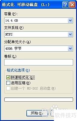 4、 插入优盘后,右键点击盘符,选择格式化,文件系统选NTFS,勾选快速格式化,最后点击开始即可执行格式化操作。