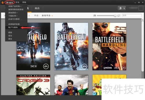 2、 点击Origin客户端左上角的Origin按钮,进入账户与隐私设置。