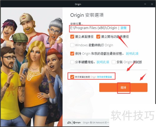 5、 选择安装位置,同意协议条款,然后点击继续按钮。