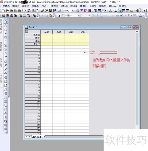 3、 在Origin中新增列数,使其与CSV文件列数一致,例如设为4列。
