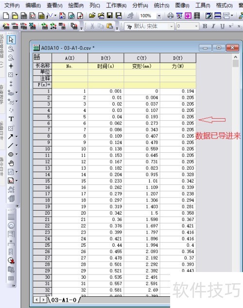 8、 点击确定后,CSV文件数据即可成功导入Origin,效果所示。