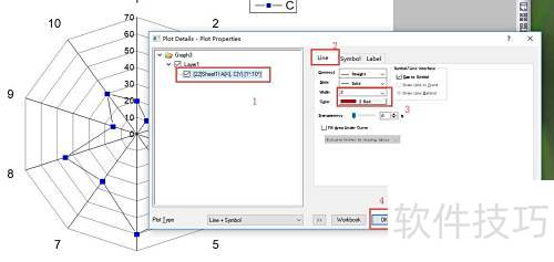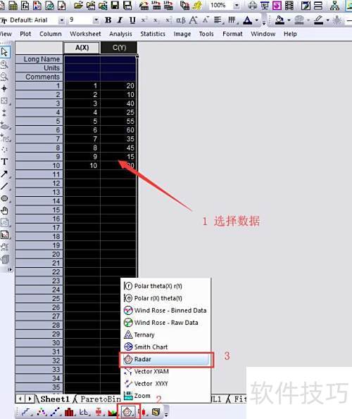 3、 选中数据后,点击工具栏右下角图标,再选择Radar选项。
