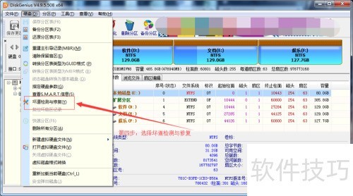 3、 选中目标磁盘后,依次点击硬盘菜单中的坏道检测与修复选项。