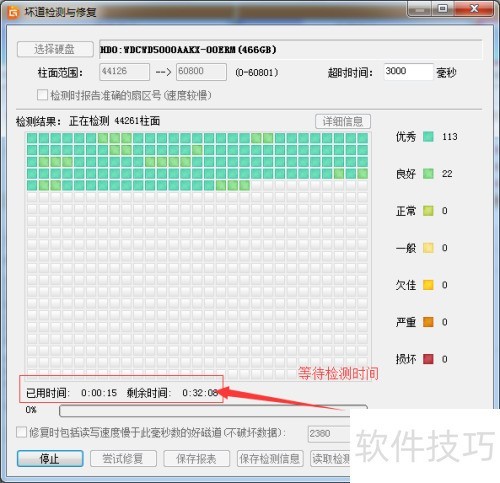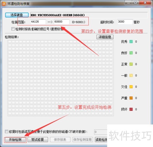 4、 进入坏道检测与修复页面后,可自定义检测范围及参数,确认设置无误后点击开始检测,即可对磁盘进行全面扫描与修复操作。