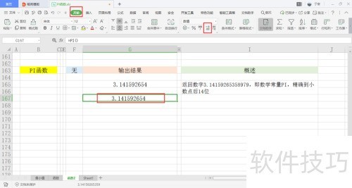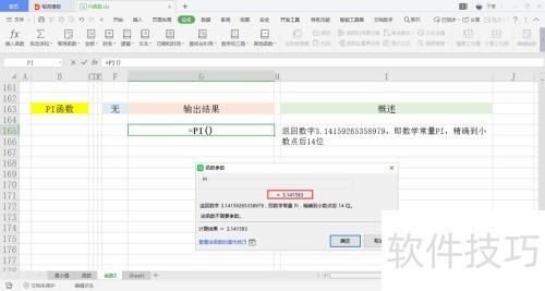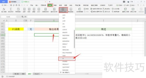 3、 在菜单栏公式中选择数学和三角函数,点击PI函数,将结果填入指定单元格。