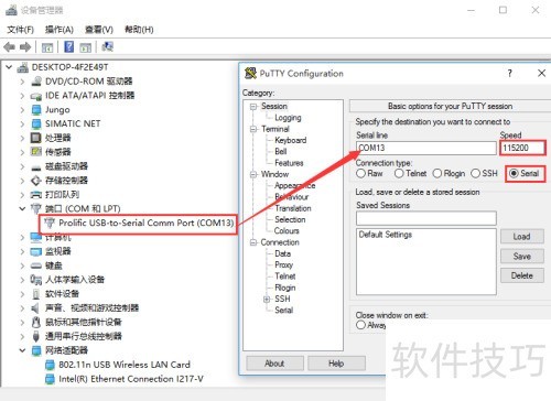 11、 启动PuTTY软件,选择串行连接类型,将端口设为串口模块对应的COM号,波特率设为115200,最后点击Open按钮即可,操作界面所示。