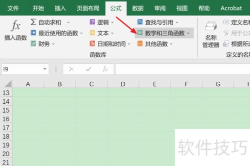 4、 在函数库组里,点击数学和三角函数的下拉箭头。