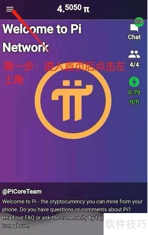 1、 打开Pi币应用,点击左上角菜单按钮。