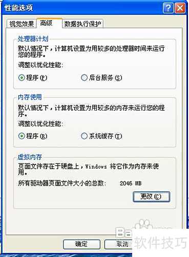 5、 在弹出的窗口中选择高级,将处理器和内存设为程序优先,接着点击虚拟内存进行修改,Windows 7操作类似。