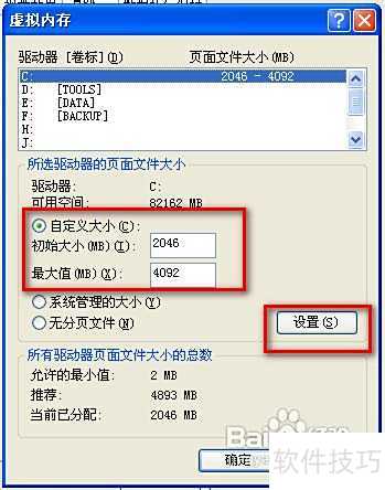 6、 在弹出的对话框中选择自定义大小,输入合适的数值,若不确定可参考下方建议。设置完成后务必点击设置,再确认,最后重启即可。