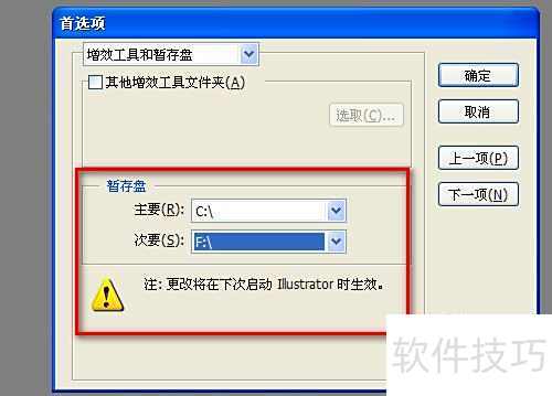 7、 接下来需要配置Adobe Illustrator CS5的暂存盘,这一步很重要,有助于提升软件处理大文件的效率。默认情况下,AI仅将系统盘作为暂存位置,而许多用户习惯将大量文件存入C盘,容易导致暂存空间不足,在编辑大型项目时可能出现错误提示,影响工作流程。合理设置可有效避免此类问题。