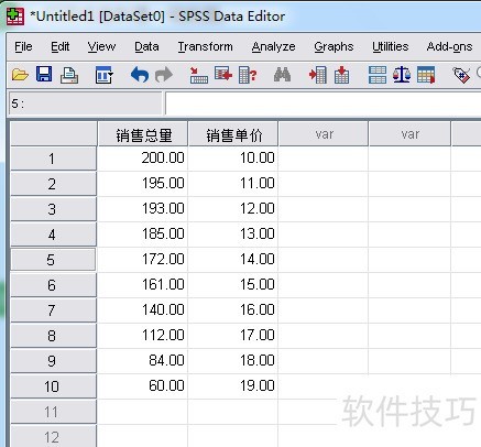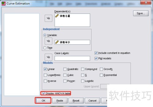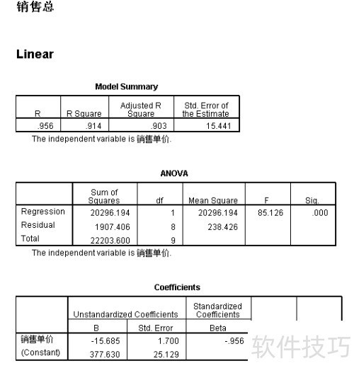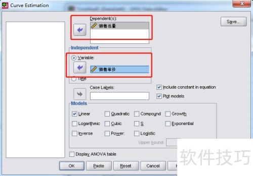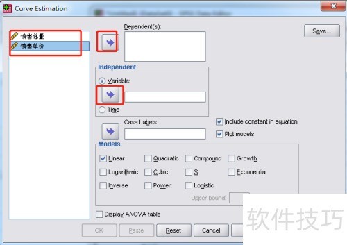 4、 把左侧的销售总量和销售单价分别用箭头按钮移至右侧的因变量和自变量框中。