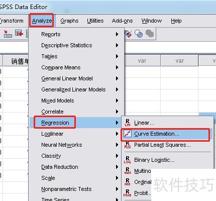 3、 依次点击分析菜单下的回归,然后选择曲线估计选项,即可进行线性分析操作。