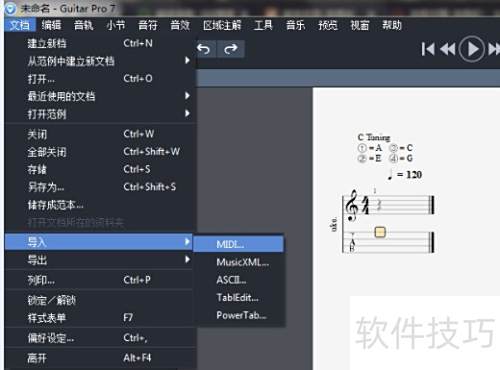 4、 Guitar Pro7可导入多种文件格式,包括MIDI、MusicXML、ASCII、TEF及PTB等,方便用户灵活使用不同来源的乐谱文件。