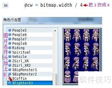 6、 将第90行中的数字3改为4后,从图中可看出VA行走图呈现为3×4结构。若要导入XP风格的4×4行走图,只需在图片名称前加上符号\$,并将原3份调整为4份即可通过。但实际情况是否如此?我们不妨修改后运行程序验证效果。具体修改如下: